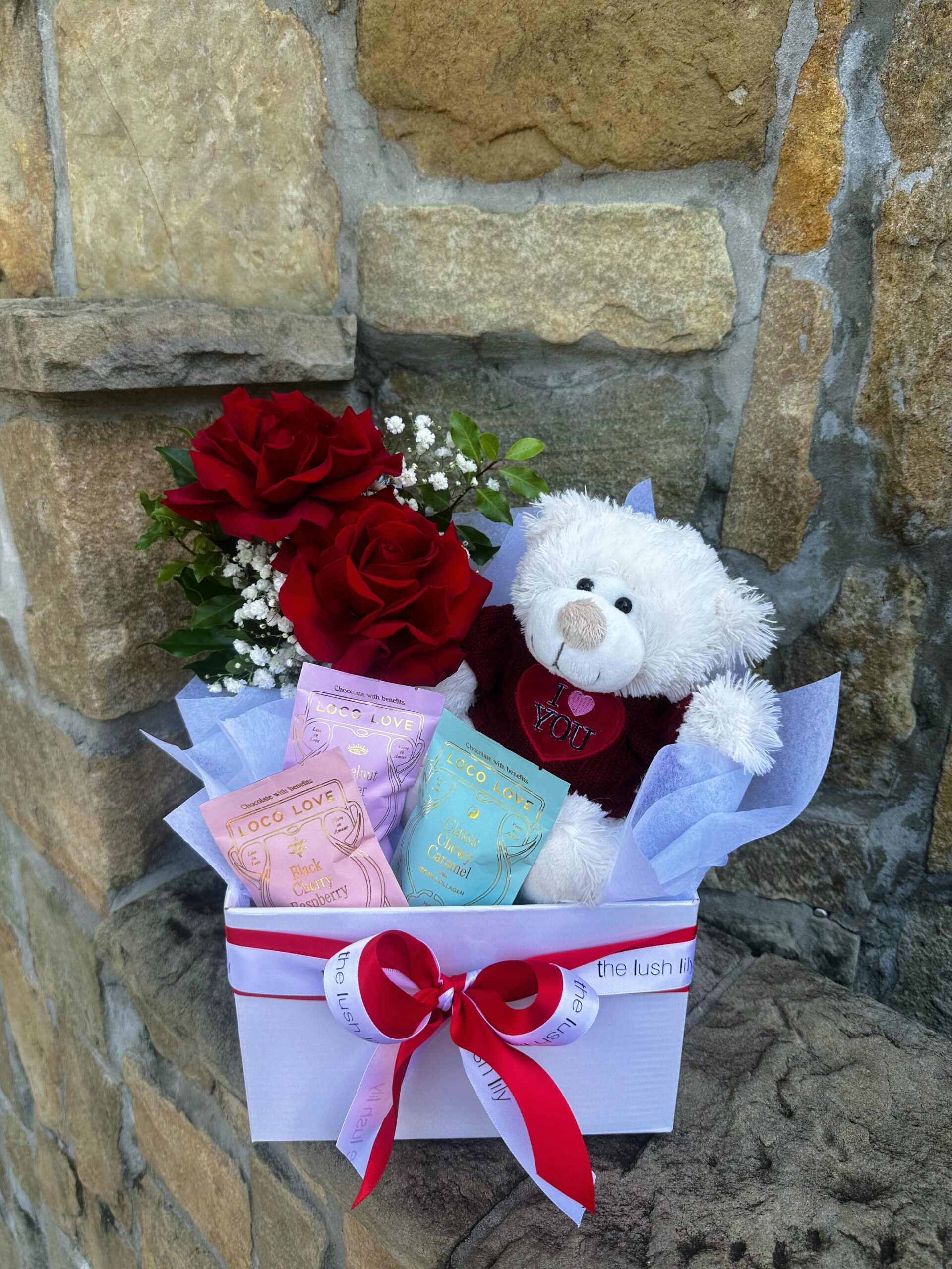 Say it with flowers, chocolate and a whole lot of love. Bae is the ultimate romantic gift hamper designed to impress, delight and melt hearts from the very first glance. Thoughtfully curated by The Lush Lily, this beautiful gift combines fresh Colombian red roses, artisan chocolates and an adorable teddy bear — all presented in our signature white gift box with soft tissue paper and ribbon.