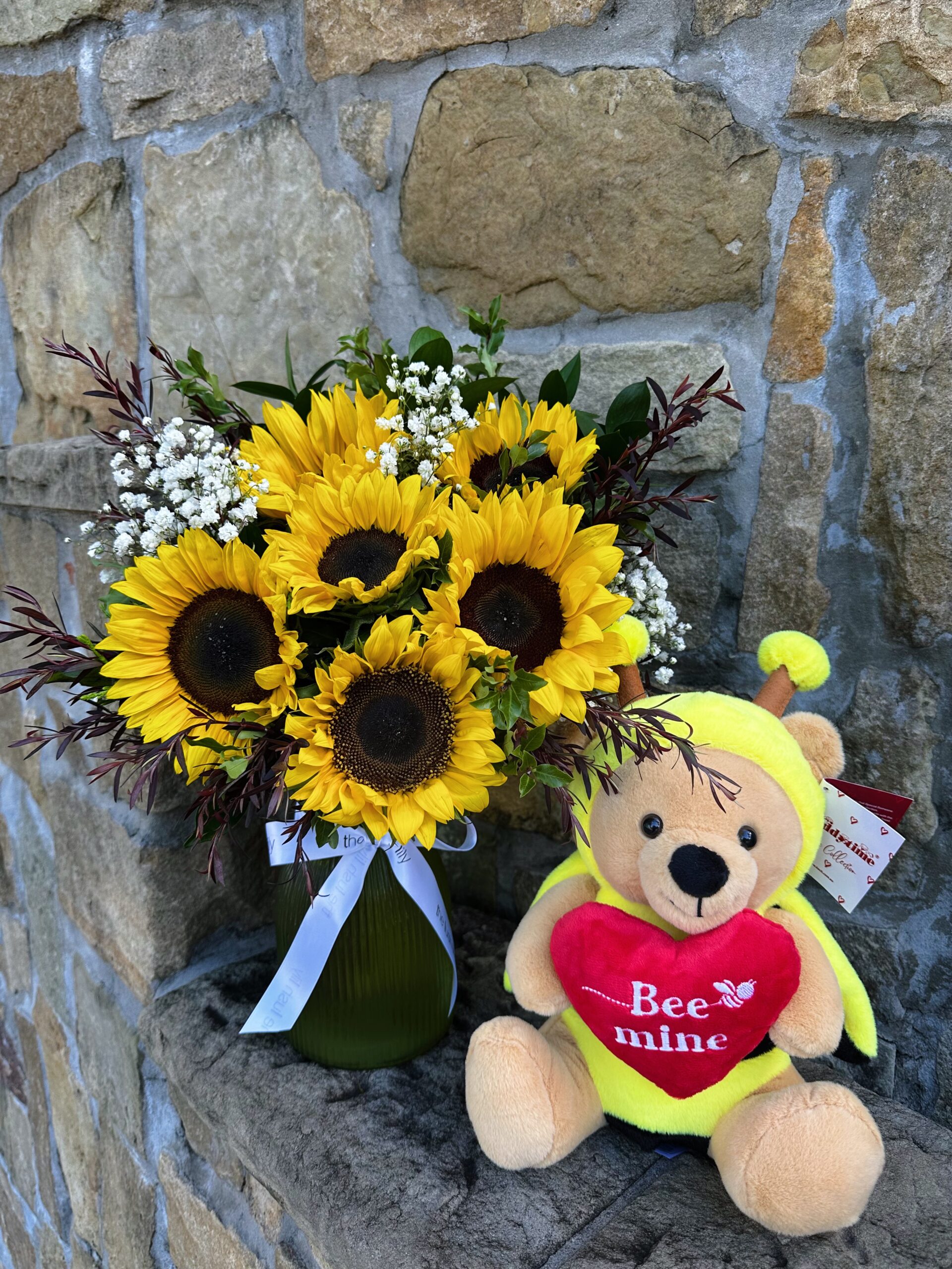 Bring instant joy, warmth and smiles with Bee Mine Sunshine sunflower vase— a bright and cheerful gift combination designed to celebrate love, happiness and heartfelt moments. Featuring vibrant sunflowers paired with an adorable plush bee bear, this arrangement is the perfect way to say “you make my heart shine.”