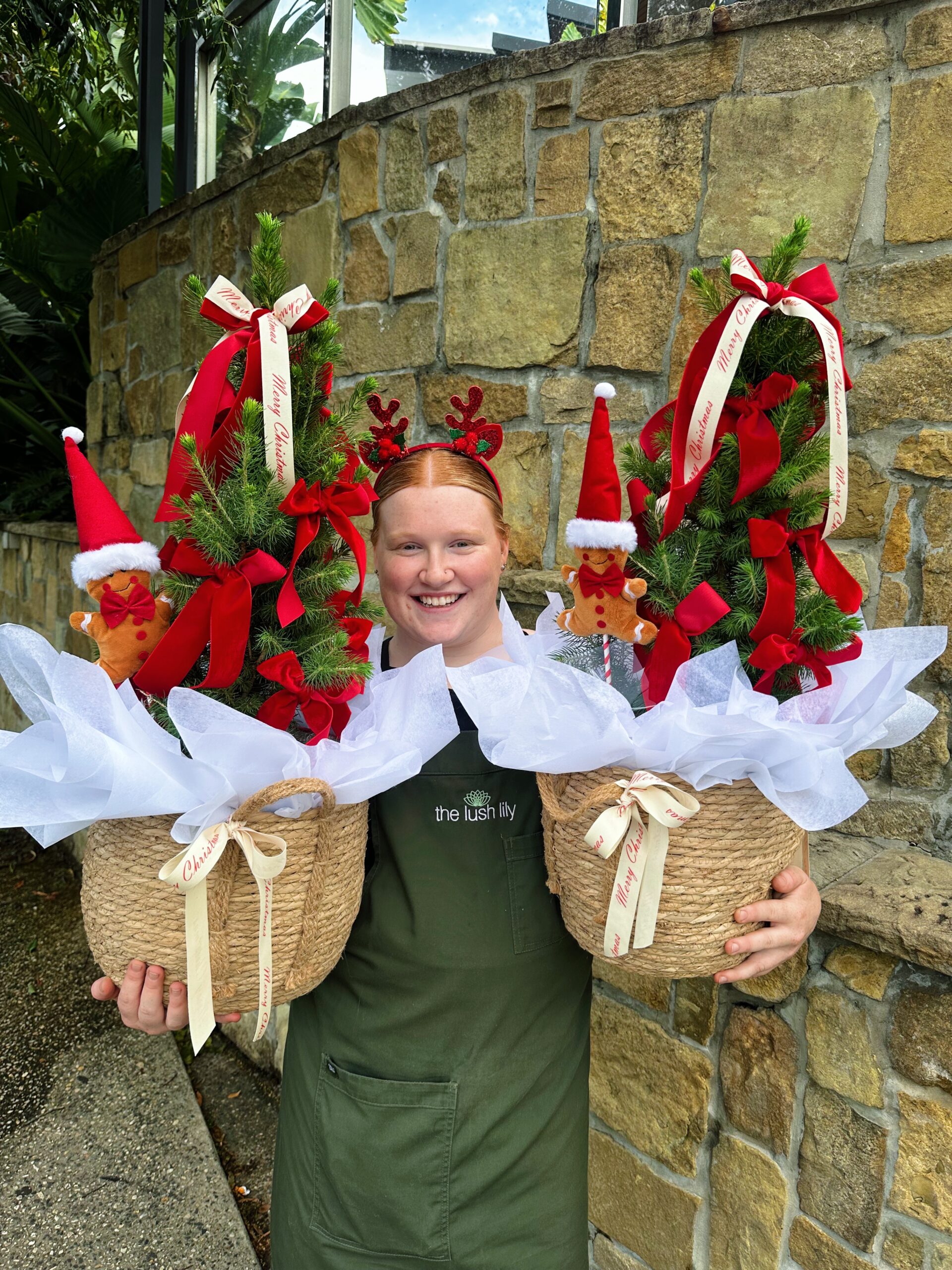 Each fresh mini tree comes arranged in a natural woven basket, finished with crisp white tissue, festive ribbons, and our signature Christmas styling. From vibrant red bows to sweet decorative accents, every tree is individually crafted by our florists to look full, festive and ready for display the moment it arrives.